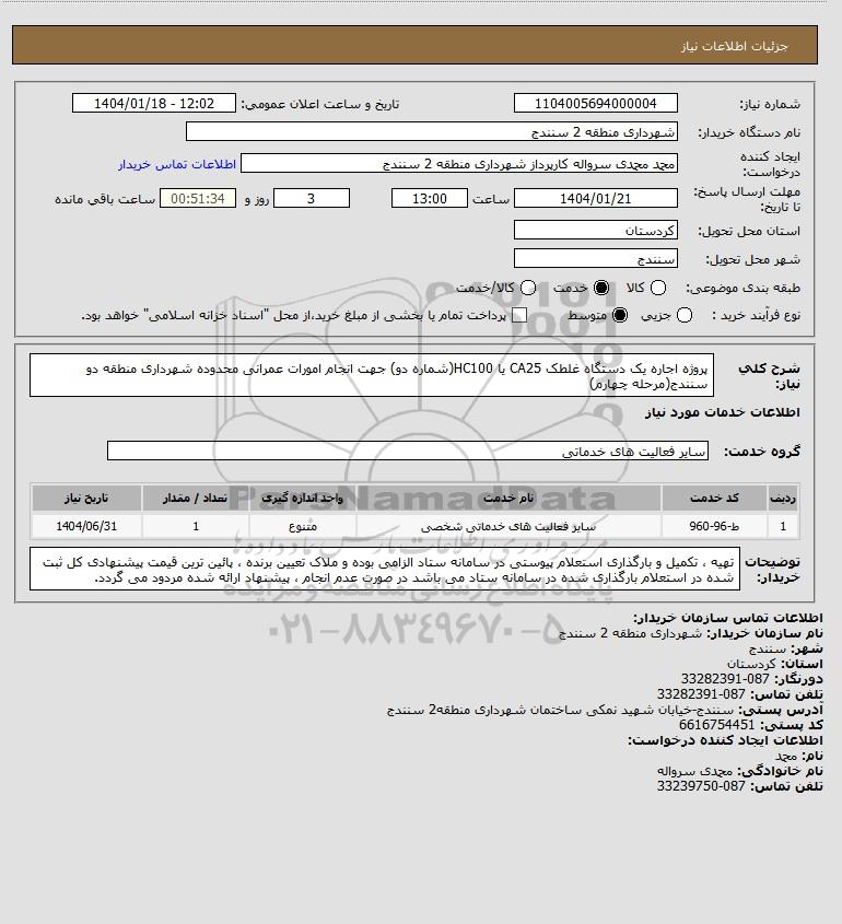 تلفن:5- 88349670 (021) فکس: 88349673 (021) Website: www.ParsNamadData.com E-mail: Info@ParsNamadData.com استعلام پروژه اجاره یک دستگاه غلطک CA25 یا HC100(شماره دو) جهت انجام امورات عمرانی محدوده شهرداری منطقه دو سنندج(مرحله چهارم)