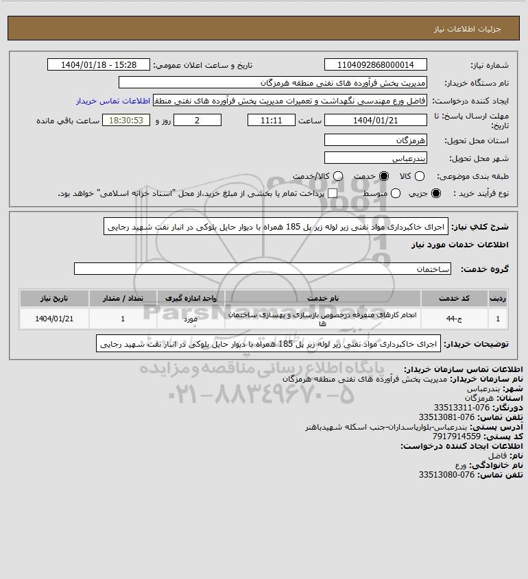 تلفن:5- 88349670 (021) فکس: 88349673 (021) Website: www.ParsNamadData.com E-mail: Info@ParsNamadData.com استعلام اجرای خاکبرداری مواد نفتی زیر لوله زیر پل 185 همراه با دیوار حایل بلوکی در انبار نفت شهید رجایی