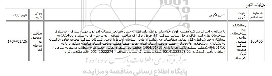 تلفن:5- 88349670 (021) فکس: 88349673 (021) Website: www.ParsNamadData.com E-mail: Info@ParsNamadData.com مناقصه عمومی دو مرحله ای پیمانکاری امور ساختمانی نواحی صنعتی شرکت مجتمع فولاد خراسان