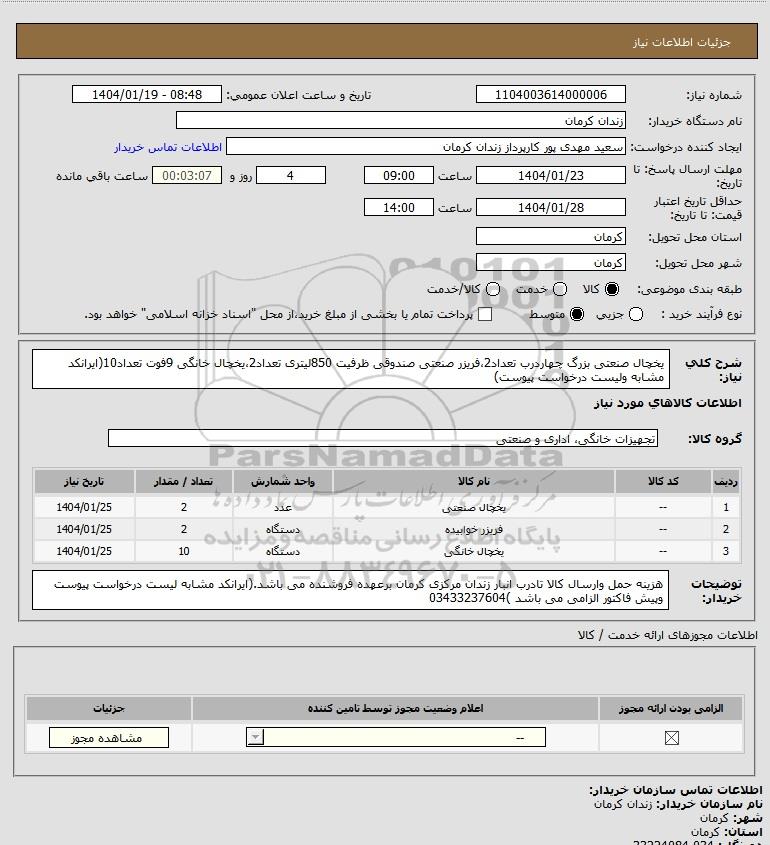 تلفن:5- 88349670 (021) فکس: 88349673 (021) Website: www.ParsNamadData.com E-mail: Info@ParsNamadData.com استعلام یخچال صنعتی بزرگ چهاردرب تعداد2فریزر صنعتی صندوقی ظرفیت 850لیتری تعداد2یخچال خانگی 9فوت تعداد10(ایرانکد مشابه ولیست درخواست پیوست)