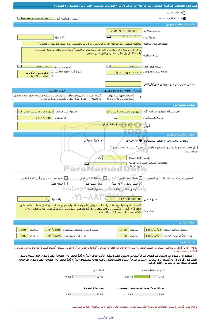 | عنوان آگهی: مناقصه مناقصه عمومی یک مرحله ای خاکبرداری وخاکریزی باماشین آلات بابیل مکانیکی وکامیون) |