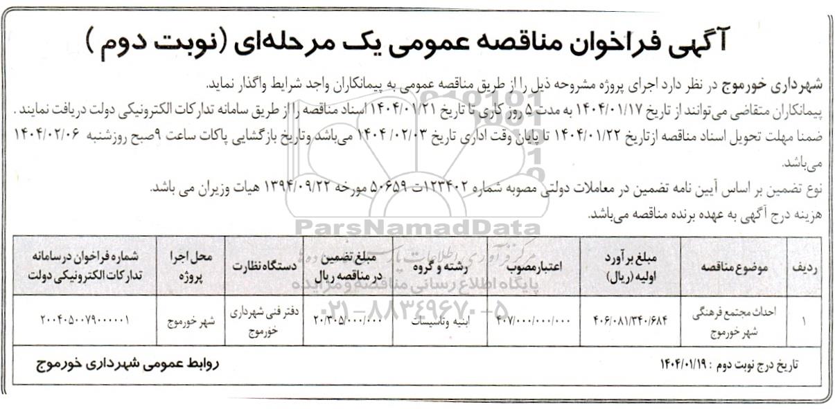 تلفن:5- 88349670 (021) فکس: 88349673 (021) Website: www.ParsNamadData.com E-mail: Info@ParsNamadData.com فراخوان مناقصه احداث مجتمع فرهنگی شهر - نوبت دوم