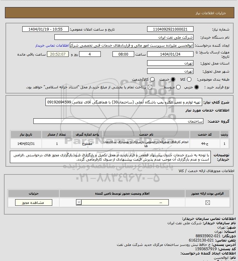 تلفن:5- 88349670 (021) فکس: 88349673 (021) Website: www.ParsNamadData.com E-mail: Info@ParsNamadData.com استعلام تهیه لوازم و تعمیر الکترو پمپ باشگاه آبعلی (ساختمان30) با هماهنگی آقای غلامی 09192694599