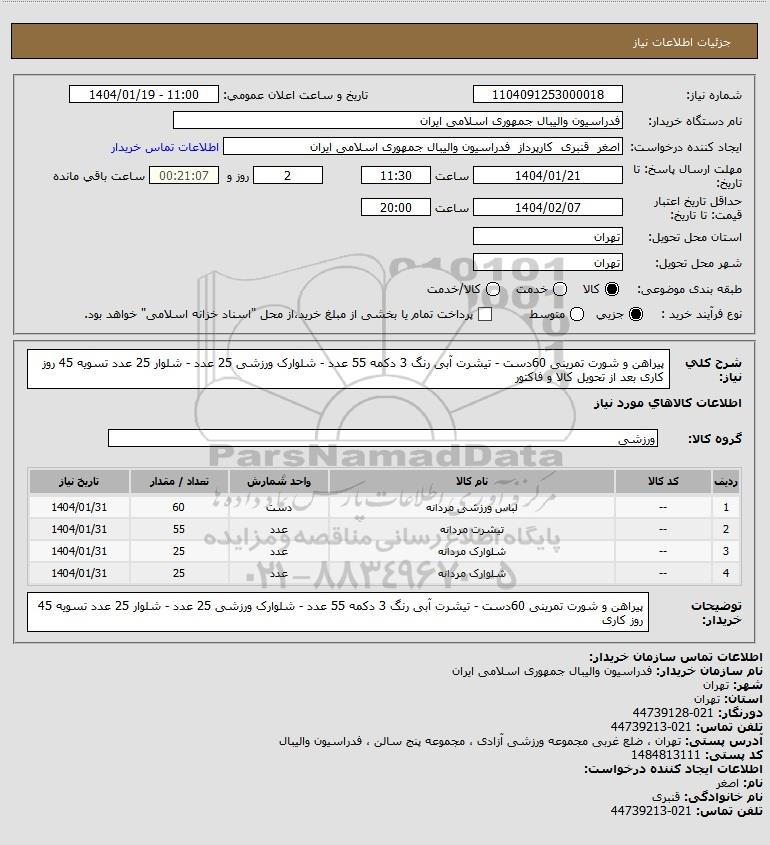 تلفن:5- 88349670 (021) فکس: 88349673 (021) Website: www.ParsNamadData.com E-mail: Info@ParsNamadData.com استعلام پیراهن و شورت تمرینی 60دست - تیشرت آبی رنگ 3 دکمه 55 عدد - شلوارک ورزشی 25 عدد - شلوار 25 عدد