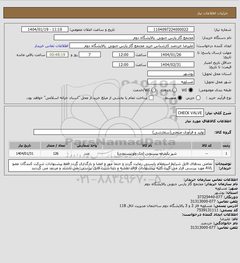 تلفن:5- 88349670 (021) فکس: 88349673 (021) Website: www.ParsNamadData.com E-mail: Info@ParsNamadData.com استعلام CHECK VALVE