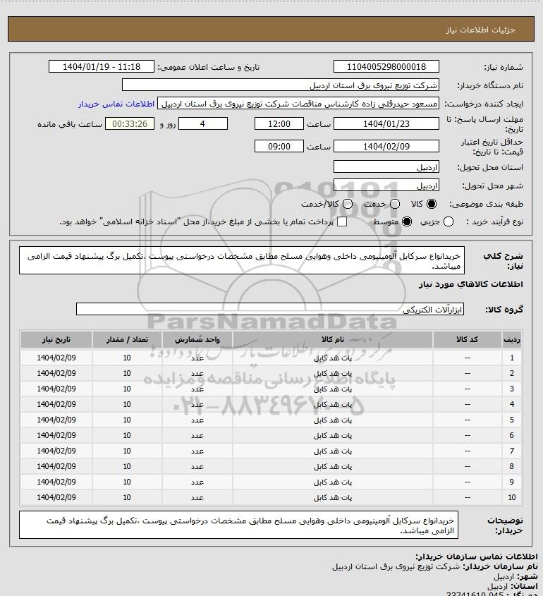 تلفن:5- 88349670 (021) فکس: 88349673 (021) Website: www.ParsNamadData.com E-mail: Info@ParsNamadData.com استعلام خریدانواع سرکابل آلومینیومی داخلی وهوایی مسلح مطابق مشخصات درخواستی پیوست تکمیل برگ پیشنهاد قیمت الزامی میباشد.