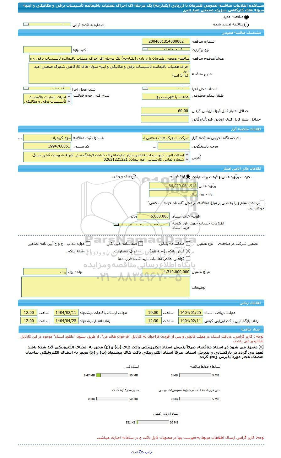 مناقصه مناقصه عمومی همزمان با ارزیابی (یکپارچه) یک مرحله ای اجرای عملیات باقیمانده تأسیسات برقی و مکانیکی و ابنیه سوله های کارگاهی شهرک صنعتی امید البرز