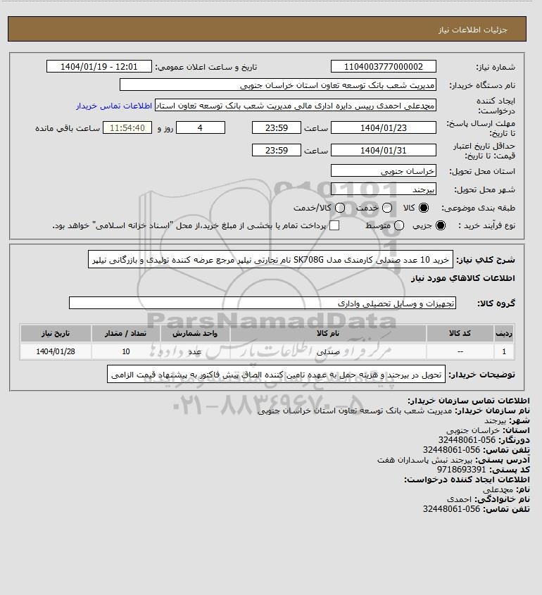 تلفن:5- 88349670 (021) فکس: 88349673 (021) Website: www.ParsNamadData.com E-mail: Info@ParsNamadData.com استعلام خرید 10 عدد صندلی کارمندی مدل SK708G نام تجارتی نیلپر مرجع عرضه کننده تولیدی و بازرگانی نیلپر