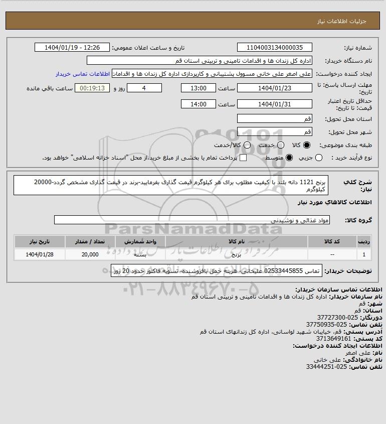 تلفن:5- 88349670 (021) فکس: 88349673 (021) Website: www.ParsNamadData.com E-mail: Info@ParsNamadData.com استعلام برنج 1121 دانه بلند با کیفیت مطلوب برای هر کیلوگرم قیمت گذاری بفرمایید-برند در قیمت گذاری مشخص گردد-20000 کیلوگرم