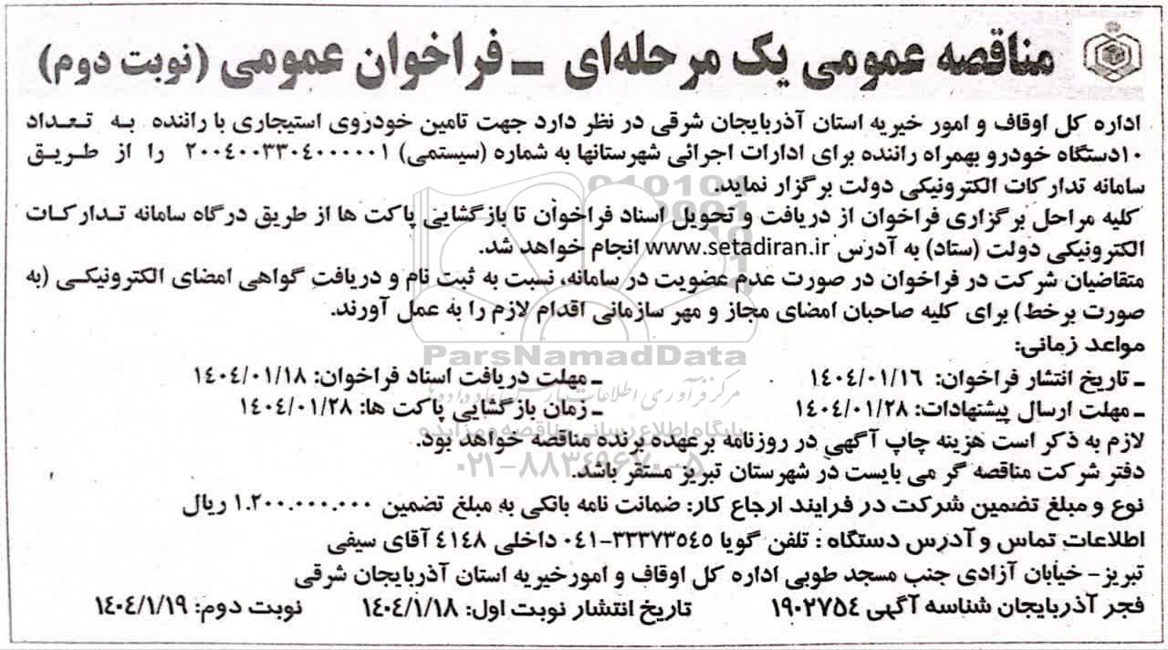 اداره کل اوقاف و امور خیریه استان آذربایجان شرقی در نظر دارد جهت تامین خودروی استیجاری با راننده به تعداد 10 دستگاه خودرو بهمراه راننده برای ادارات اجرایی شهرستانها به شماره سیستمی 2004003304000001 را از طریق سامانه تدارکات الکترونیک دولت برگزار نماید.