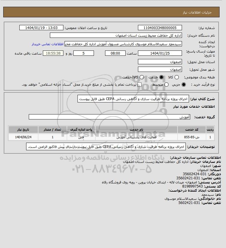 تلفن:5- 88349670 (021) فکس: 88349673 (021) Website: www.ParsNamadData.com E-mail: Info@ParsNamadData.com استعلام اجرای پروژه برنامه ظرفیت سازی و آگاهی رسانی CEPA طبق فایل پیوست