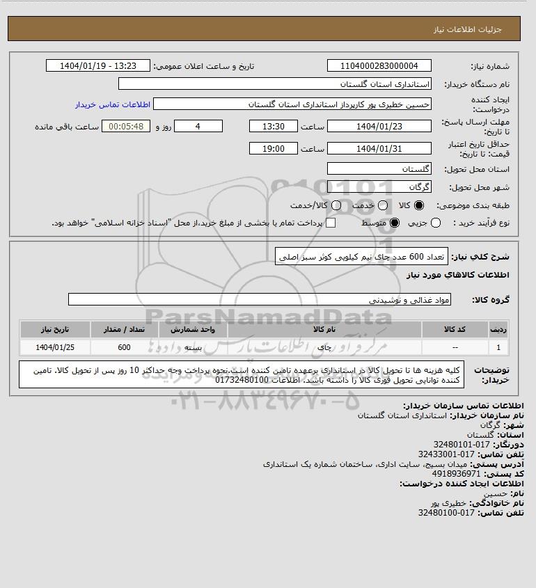 تلفن:5- 88349670 (021) فکس: 88349673 (021) Website: www.ParsNamadData.com E-mail: Info@ParsNamadData.com استعلام تعداد 600 عدد چای نیم کیلویی کوثر سبز اصلی