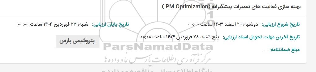 تلفن:5- 88349670 (021) فکس: 88349673 (021) Website: www.ParsNamadData.com E-mail: Info@ParsNamadData.com استعلام بهینه سازی فعالیت های تعمیرات پیشگیرانه (PM Optimization)