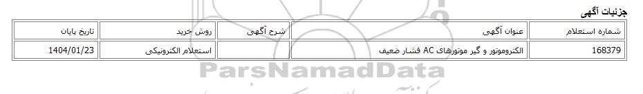 تلفن:5- 88349670 (021) فکس: 88349673 (021) Website: www.ParsNamadData.com E-mail: Info@ParsNamadData.com استعلام الکترونیکی الکتروموتور و گیر موتورهای AC فشار ضعیف