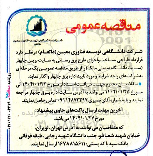 تلفن:5- 88349670 (021) فکس: 88349673 (021) Website: www.ParsNamadData.com E-mail: Info@ParsNamadData.com مناقصه قرارداد طراحی، ساخت و اجرای طرح برق رسانی به سایت