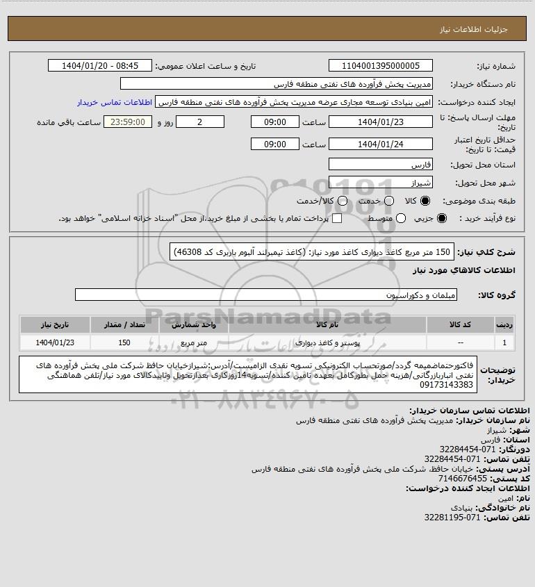 تلفن:5- 88349670 (021) فکس: 88349673 (021) Website: www.ParsNamadData.com E-mail: Info@ParsNamadData.com استعلام 150 متر مربع کاغذ دیواری کاغذ مورد نیاز: (کاغذ تیمبرلند آلبوم باربری کد 46308)