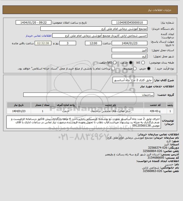 تلفن:5- 88349670 (021) فکس: 88349673 (021) Website: www.ParsNamadData.com E-mail: Info@ParsNamadData.com استعلام عایق کاری 2 عدد چاه آسانسور