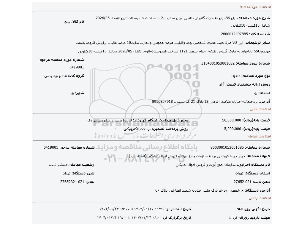 | شماره معامله: 3003001053001085 | | شماره معامله مرجع: 0419001 | | عنوان معامله: حراج خرده فروشی برخط سازمان جمع آوری و فروش اموال تملیکی (استان یزد) | | نام دستگاه اجرایی: سازمان جمع آوری و فروش اموال تملیکی | | وضعیت معامله: منتشر شده | | استان دستگاه: تهران | | شهر دستگاه: تهران | | تلفن ثابت: 021-27652 | | نمابر: 021-27652321 | | آدرس دستگاه: خ ولیعصر، روبروی پارک ملت، خیابان شهید انصاری ، پلاک 67 |