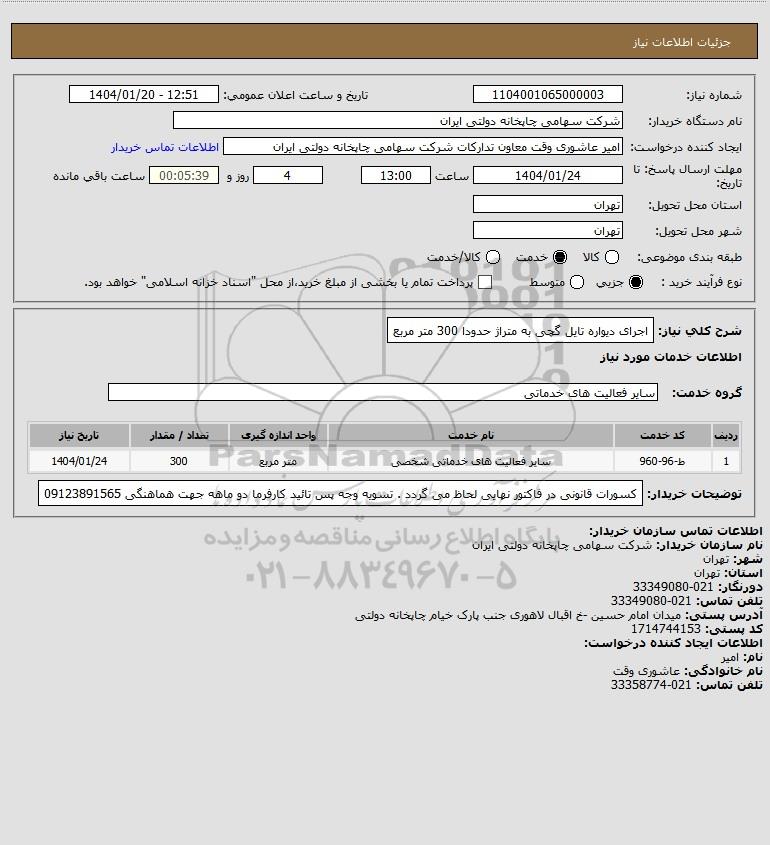 تلفن:5- 88349670 (021) فکس: 88349673 (021) Website: www.ParsNamadData.com E-mail: Info@ParsNamadData.com استعلام اجرای دیواره تایل گچی به متراژ حدودا 300 متر مربع