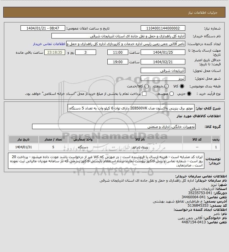 تلفن:5- 88349670 (021) فکس: 88349673 (021) Website: www.ParsNamadData.com E-mail: Info@ParsNamadData.com استعلام موتور برق بنزینی واکسون مدل 2E8500VK دارای توان 6 کیلو وات به تعداد 5 دستگاه