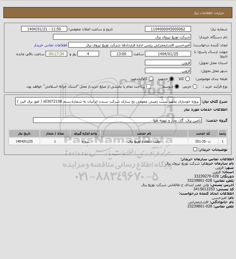 تلفن:5- 88349670 (021) فکس: 88349673 (021) Website: www.ParsNamadData.com E-mail: Info@ParsNamadData.com استعلام پروژه خودیاری تجهیز پست زمینی عمومی یخ سازی شرکت سندن ایرانیان به شماره سنم s03072108 ( امور برق البرز )
