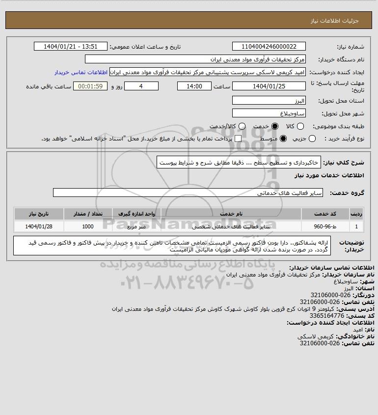 تلفن:5- 88349670 (021) فکس: 88349673 (021) Website: www.ParsNamadData.com E-mail: Info@ParsNamadData.com استعلام خاکبرداری و تسطیح سطح ... ذقیقا مطابق شرح و شرایط پیوست