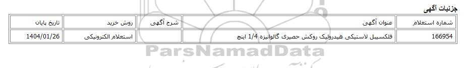 تلفن:5- 88349670 (021) فکس: 88349673 (021) Website: www.ParsNamadData.com E-mail: Info@ParsNamadData.com استعلام الکترونیکی فلکسیبل لاستیکی هیدرولیک روکش حصیری گالوانیزه 1/4 اینچ