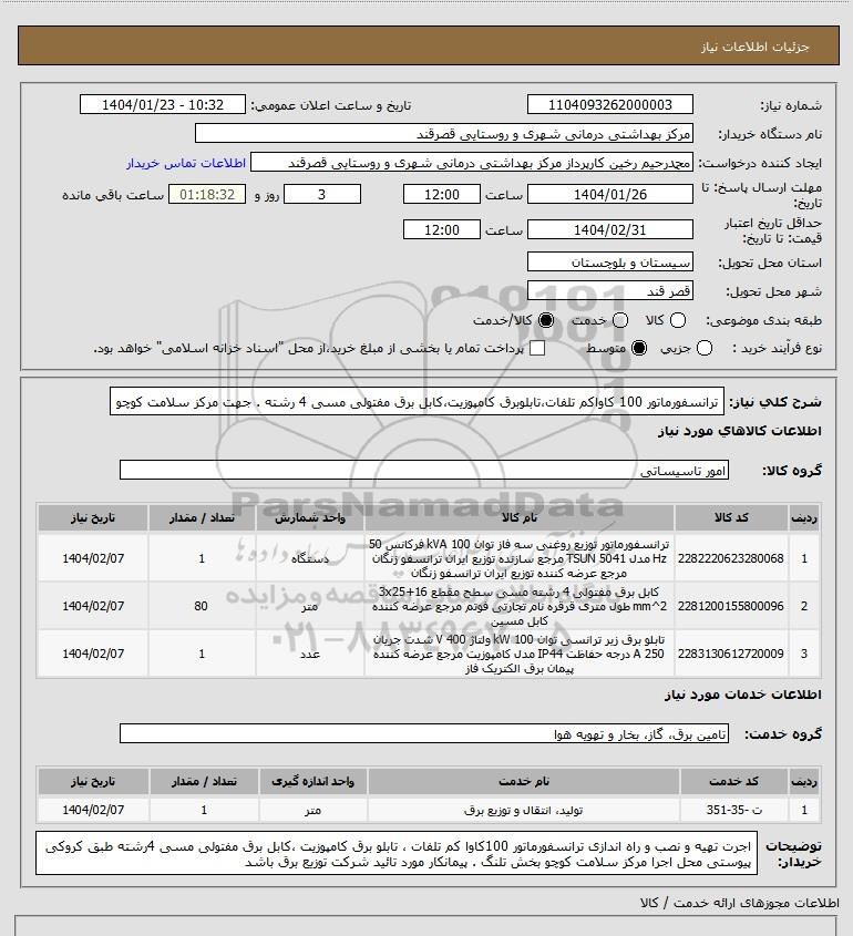 تلفن:5- 88349670 (021) فکس: 88349673 (021) Website: www.ParsNamadData.com E-mail: Info@ParsNamadData.com استعلام ترانسفورماتور 100 کاواکم تلفاتتابلوبرق کامپوزیتکابل برق مفتولی مسی 4 رشته . جهت مرکز سلامت کوچو