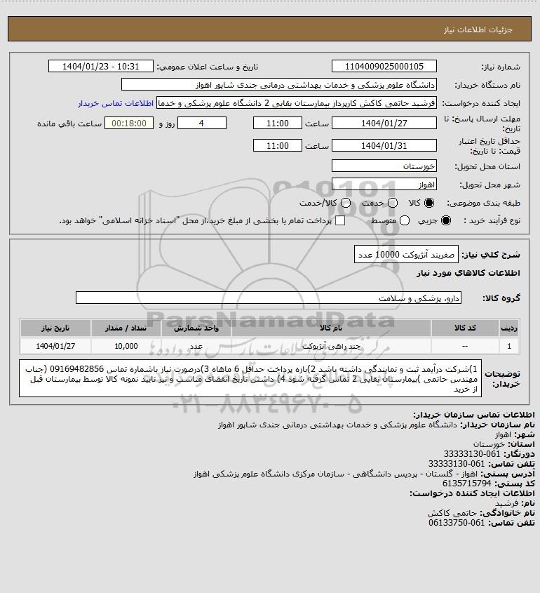 تلفن:5- 88349670 (021) فکس: 88349673 (021) Website: www.ParsNamadData.com E-mail: Info@ParsNamadData.com استعلام صفربند آنژیوکت 10000 عدد