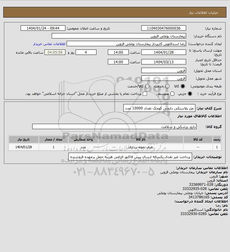 تلفن:5- 88349670 (021) فکس: 88349673 (021) Website: www.ParsNamadData.com E-mail: Info@ParsNamadData.com استعلام مژر پلاستکی دارویی کوچک تعداد 10000 عدد