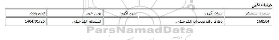 تلفن:5- 88349670 (021) فکس: 88349673 (021) Website: www.ParsNamadData.com E-mail: Info@ParsNamadData.com استعلام الکترونیکی باطری برای تجهیزات الکترونیکی