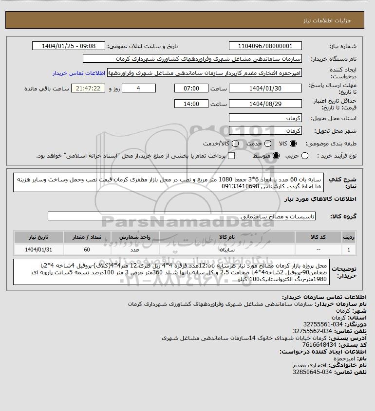 تلفن:5- 88349670 (021) فکس: 88349673 (021) Website: www.ParsNamadData.com E-mail: Info@ParsNamadData.com استعلام سایه بان 60 عدد با ابعاد 6*3 جمعا 1080 متر مربع و نصب در محل بازار مظفری کرمان قیمت نصب وحمل وساخت وسایر هزینه ها لحاظ گردد. کارشناس 09133410698