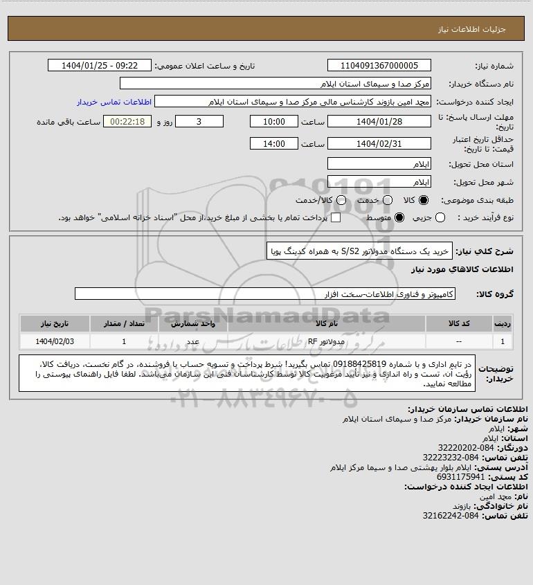 تلفن:5- 88349670 (021) فکس: 88349673 (021) Website: www.ParsNamadData.com E-mail: Info@ParsNamadData.com استعلام خرید یک دستگاه مدولاتور S/S2 به همراه کدینگ پویا