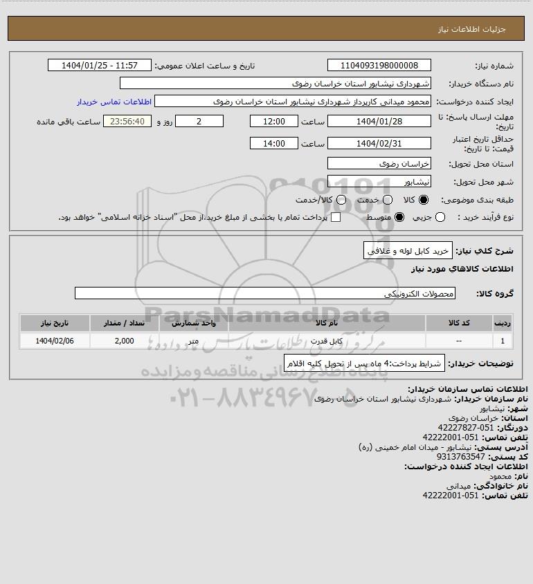 تلفن:5- 88349670 (021) فکس: 88349673 (021) Website: www.ParsNamadData.com E-mail: Info@ParsNamadData.com استعلام خرید کابل لوله و غلافی