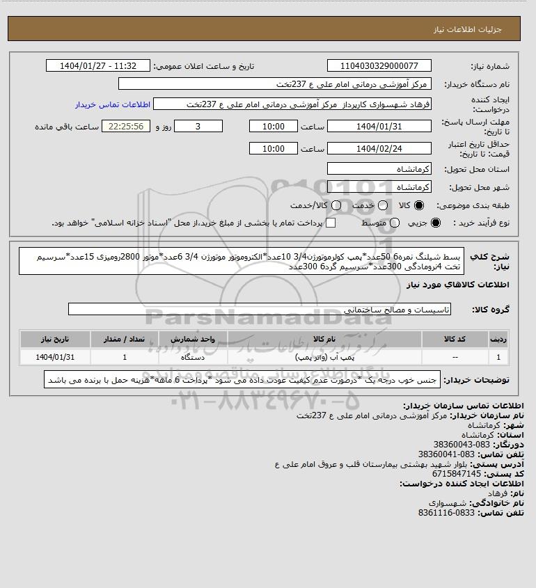 تلفن:5- 88349670 (021) فکس: 88349673 (021) Website: www.ParsNamadData.com E-mail: Info@ParsNamadData.com استعلام بسط شیلنگ نمره6 50عدد*پمپ کولرموتورژن3/4 10عدد*الکتروموتور موتورژن 3/4 6عدد*موتور 2800رومیزی 15عدد*سرسیم تخت 4نرومادگی 300عدد*سرسیم گرد6 300عدد