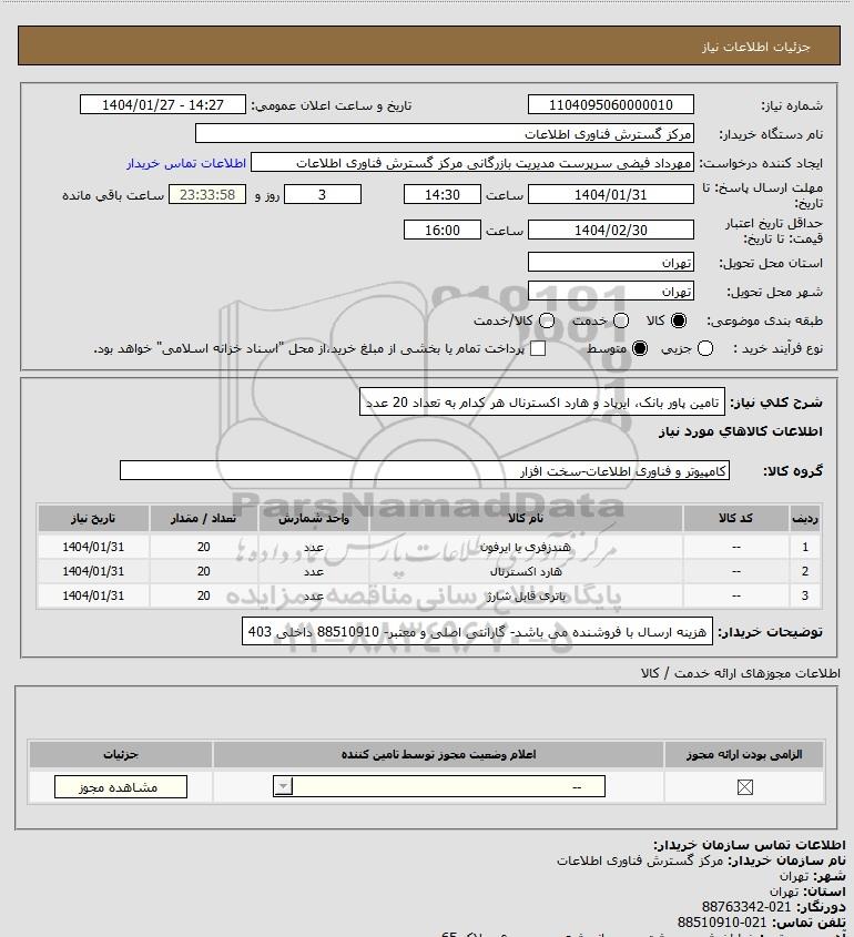 تلفن:5- 88349670 (021) فکس: 88349673 (021) Website: www.ParsNamadData.com E-mail: Info@ParsNamadData.com استعلام تامین پاور بانک ایرپاد و هارد اکسترنال هر کدام به تعداد 20 عدد