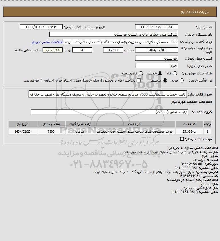تلفن:5- 88349670 (021) فکس: 88349673 (021) Website: www.ParsNamadData.com E-mail: Info@ParsNamadData.com استعلام تامین خدمات سندبلاست 7500 مترمربع سطوح فلزی و تجهیزات جانبی و موردی دستگاه ها و تجهیزات حفاری