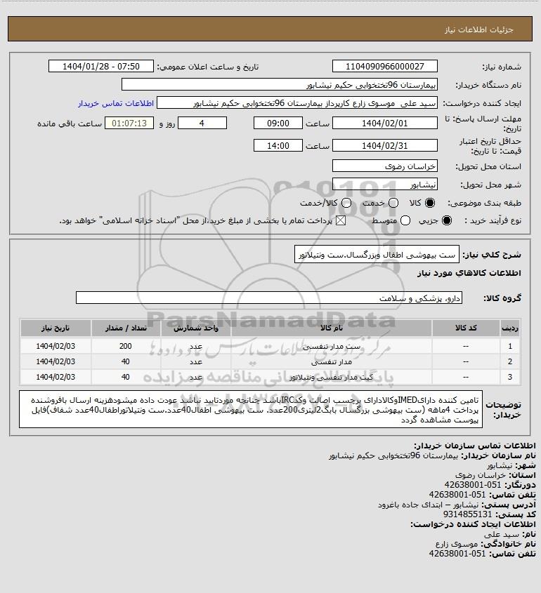 تلفن:5- 88349670 (021) فکس: 88349673 (021) Website: www.ParsNamadData.com E-mail: Info@ParsNamadData.com استعلام ست بیهوشی اطفال وبزرگسال.ست ونتیلاتور