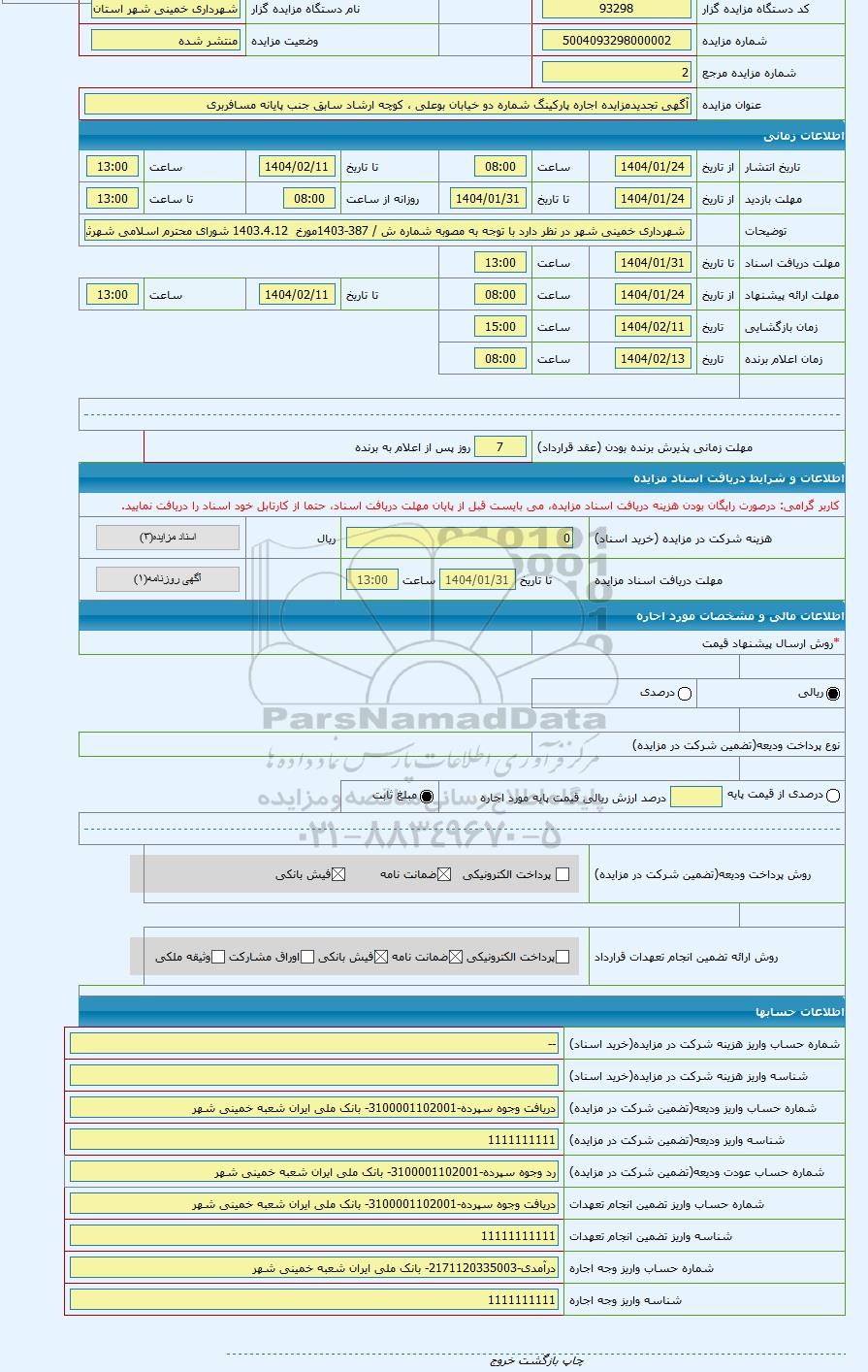 اطلاعات زمانی| تاریخ انتشار از تاریخ | 1404/01/24 | ساعت | 08:00 | تا تاریخ | 1404/02/11 | ساعت | 13:00 | | مهلت بازدید از | 1404/01/24 | تا تاریخ | 1404/01/31 | روزانه از ساعت | 08:00 | تا ساعت | 13:00 | | توضیحات | شهرداری خمینی شهر در نظر دارد با توجه به مصوبه شماره ش / 387-1403مورخ 1403.4.12 شورای محترم اسلامی شهرثبت در سامانه تدارکات دولت به شماره 5004093298000002مورخه1404.1.19 نسبت به اجاره پارکینگ شماره | | مهلت ارائه پیشنهاد از تاریخ | 1404/01/24 | ساعت | 08:00 | تا تاریخ | 1404/02/11 | ساعت | 13:00 | | زمان بازگشایی تاریخ | 1404/02/11 | ساعت | 15:00 | | زمان اعلام برنده تاریخ | 1404/02/13 | ساعت | 08:00 |