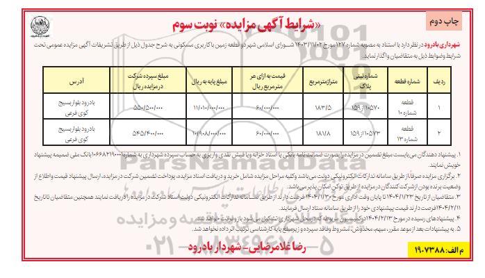 تلفن:5- 88349670 (021) فکس: 88349673 (021) Website: www.ParsNamadData.com E-mail: Info@ParsNamadData.com مزایده واگذاری دو قطعه زمین با کاربری مسکونی نوبت سوم- چاپ دوم