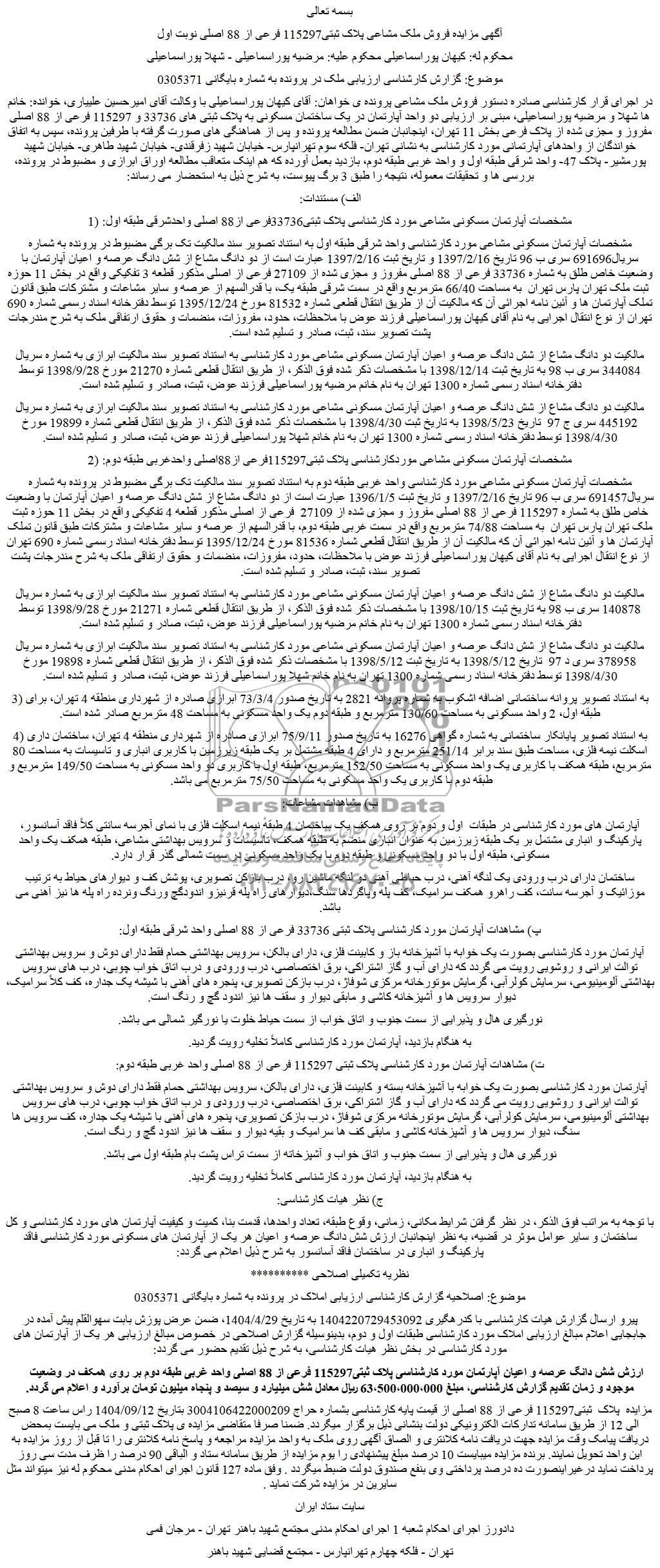 مشخصات آپارتمان مسکونی مشاعی مورد کارشناسی واحد شرقی طبقه اول به استناد تصویر سند مالکیت تک برگی مضبوط در پرونده به شماره سریال691696 سری ب 96 تاریخ 1397.2.16 و تاریخ ثبت 1397.2.16 عبارت است از دو دانگ مشاع از شش دانگ عرصه و اعیان آپارتمان با وضعیت خاص طلق به شماره 33736 فرعی از 88 اصلی مفروز و مجزی شده از 27109 فرعی از اصلی مذکور قطعه 3 تفکیکی واقع در بخش 11 حوزه ثبت ملک تهران پارس تهران به مساحت 66/40 مترمربع واقع در سمت شرقی طبقه یک، با قدرالسهم از عرصه و سایر مشاعات و مشترکات طبق قانون تملک آپارتمان ها و آئین نامه اجرائی آن که مالکیت آن از طریق انتقال قطعی شماره 81532 مورخ 1395.12.24 توسط دفترخانه اسناد رسمی شماره 690 تهران از نوع انتقال اجرایی به نام آقای کیهان پوراسماعیلی فرزند عوض با ملاحظات، حدود، مفروزات، منضمات و حقوق ارتفاقی ملک به شرح مندرجات پشت تصویر سند، ثبت، صادر و تسلیم شده است.