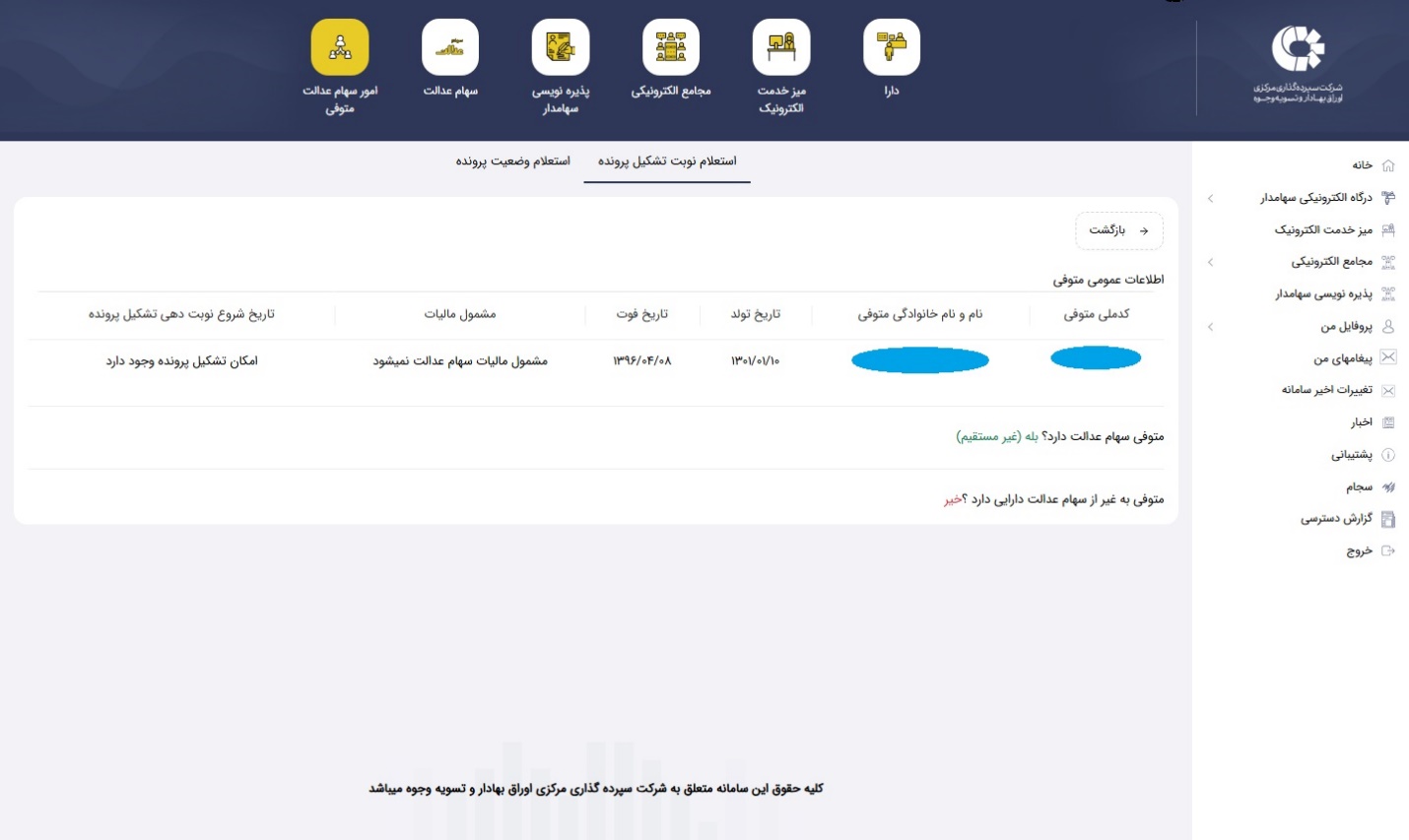 چنانچه در قسمت پایین صفحه، عبارت " متوفی سهام عدالت دارد؟ بله (غیر مستقیم)" را مشاهده کردید، یعنی سهام عدالت متوفی جزو دارایی های او محسوب میشود. پس میتوان برای انتقال و گرفتن آن اقدام نمود.