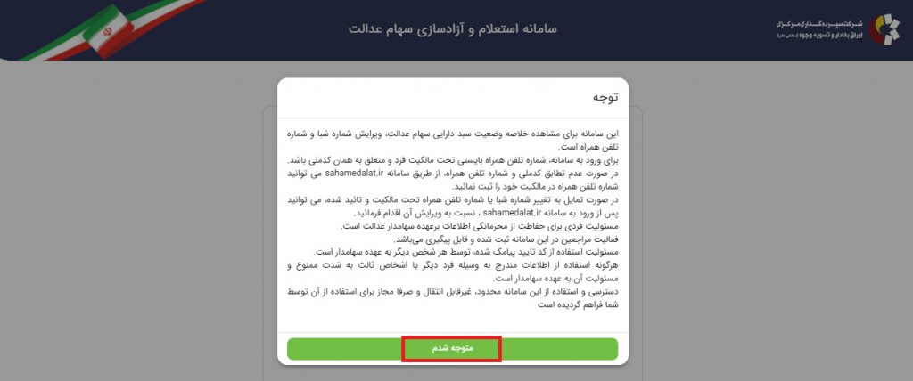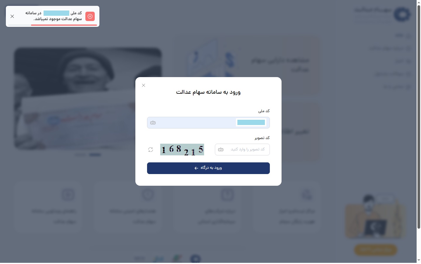 • چنانچه از دریافت سهام دولتی محروم باشید، با پیغام " کد ملی ..... در سامانه سهام عدالت موجود نمیباشد." مواجه خواهید شد.