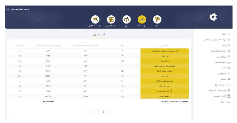 • اگر اطلاعات وارد شده صحیح باشد، شما به صفحه دارایی های سهام خود وارد میشوید. در این صفحه همه سهام ها به صورت کامل نمایش داده میشوند.