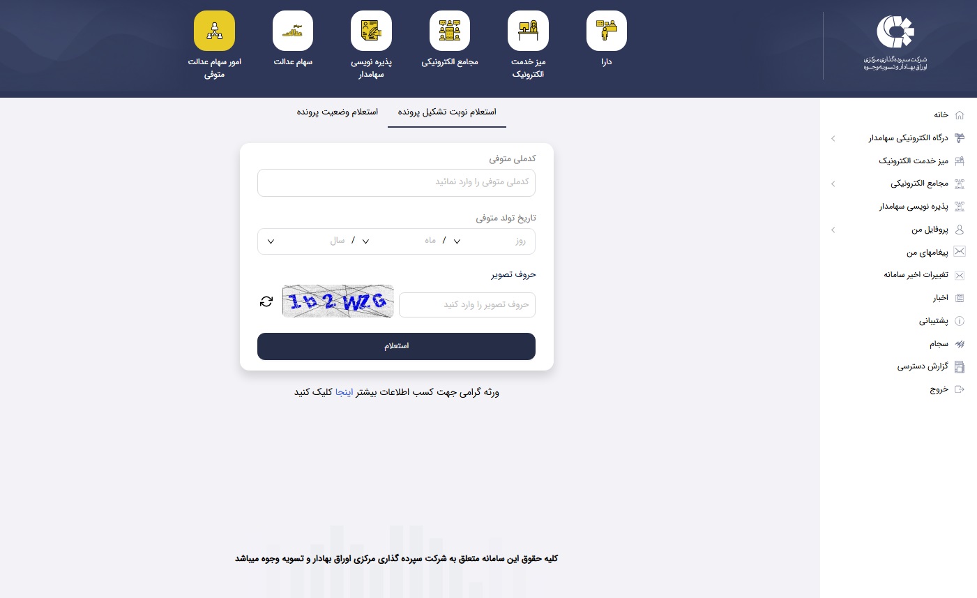 • سپس یکی از وراث از طریق درگاه یکپارچه ذینفعان بازار سرمایه، درخواست تشکیل پرونده نماید.