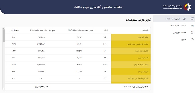 • برای اطلاع از وضعیت سهام های دولتی در فهرست بالای صفحه، روی گزینه تاریخچه سود سهام عدالت کلیک نمایید.