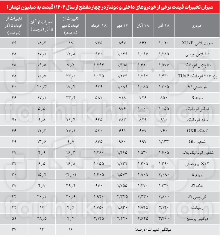 از طرفی از ۱۸ خرداد تا امروز، قیمت خودروها حدود ۴۰ درصد جهش داشته و بسیاری از مدلها؛ از ۲۰۶ تیپ ۲ گرفته تا دنا پلاس و تارا، بین ۲۲ تا ۵۹ درصد گرانتر شدهاند. با این حساب جهش قیمت در ۱۸ روز آذرماه داغتر از ۴ ماه اخیر پس از جنگ بودهاست.(اقتصاد ایران)