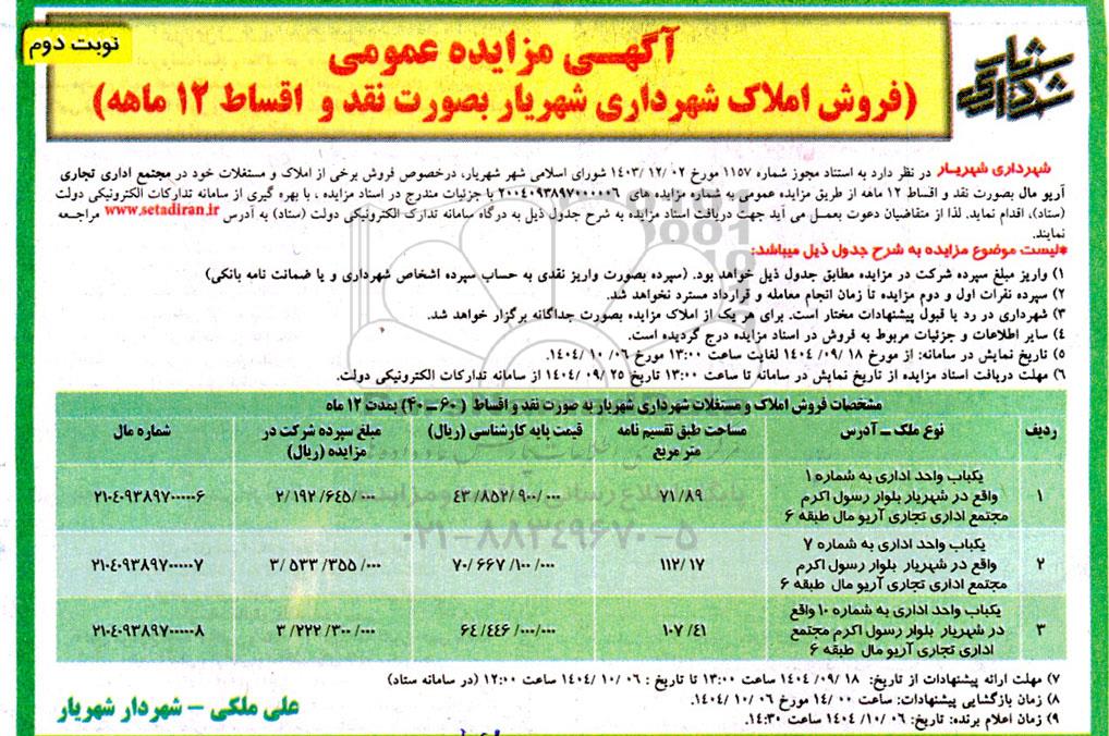شهرداری شهریار در نظر دارد به استناد مجوز شماره 1157 مورخ 1403.12.02 شورای اسلامی شهر شهریار در خصوص فروش برخی از املاک و مستغلات خود در مجتمع اداری تجاری آریو مال بصورت نقد و اقساط 12 ماهه از طریق مزایده عمومی به شماره مزایده های 2004093897000006 با جزئیات مندرج در اسناد مزایده با بهره گیری از سامانه تدارکات الکترونیکی دولت (ستاد)، اقدام نماید. لذا از متقاضیان دعوت بعمل می آید جهت دریافت اسناد مزایده به شرح جدول ذیل به درگاه سامانه تدارک الکترونیکی دولت (ستاد) به آدرس سایت ستاد ایران مراجعه نمایند.