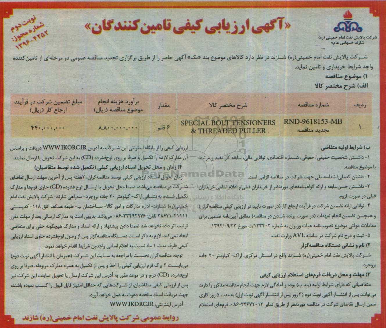 ارزیابی کیفی تامین کنندگان SPECIAL BOLT TENSIONERS THREADED PULLER (نوبت دوم) از کلیه افراد متخصص و شرکتها واجد شرایط دعوت به عمل میآید در مناقصه با کد خبرگزاری پارس نماد: 1000008 شرکت نمایند.