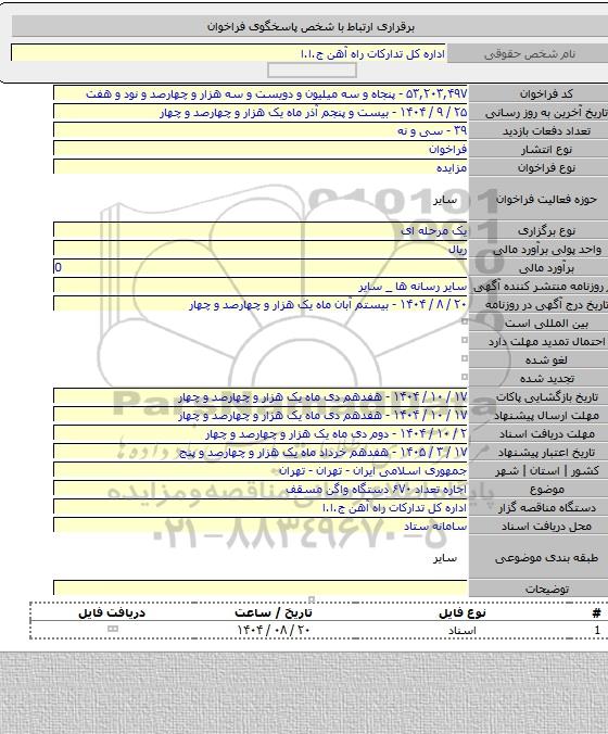 مزایده عمومی مزایده اجاره تعداد ۶۷۰ دستگاه واگن مسقف برگزار میگردد. از کلیه افراد متخصص و شرکتهای واجد شرایط دعوت به عمل میآید تا در این مزایده با کد خبرگزاری پارس نماد : 10000186 شرکت نمایند تاریخ شروع مزایده : 1404/09/24 مهلت شرکت در مزایده: تا پایان روز 1404/10/02 مکان برگزاری اموال واگذاری استانهای مزایدات استان تهران و دستهبندیهای مربوط به این حراجی راه آهن میباشد.